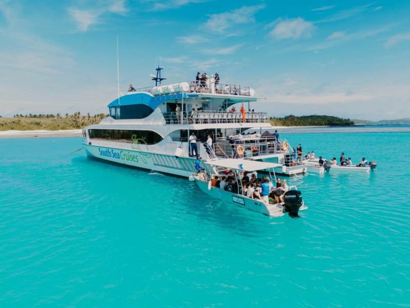 Featuring a 259 seating capacity, fully licensed bar, café and outdoor viewing decks the Yasawa flyer is the best way to island hop between Denarau and Yasawa. The journey can take between 30 minutes and 5 hours depending on which island you would like to visit. Show the staff from Awesome Adventures Fiji (a.k.a. South Sea Cruises) your booking confirmation(s) at Denarau Marina and they will provide you with your boarding pass. Check-in is possible from 1 hour before departure, and it's strongly reccommended to be at the check-in at least 30 minutes in advance. All relevant details and contact info is found on your e-ticket from us.